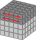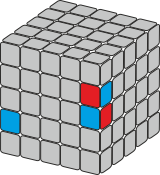 | 上图中的特殊情况,可把它当做五阶魔方上的单独翻转一个内棱块来理解,和四阶魔方的单独翻转一组棱块很相似,从公式的步骤上来看,步骤完全一样,只是中间有一个,在五阶魔方上需要转动3层,如上公式中标红色的部分。理解了这点关系,五阶魔方的单内棱块公式就非常好记忆了。 |